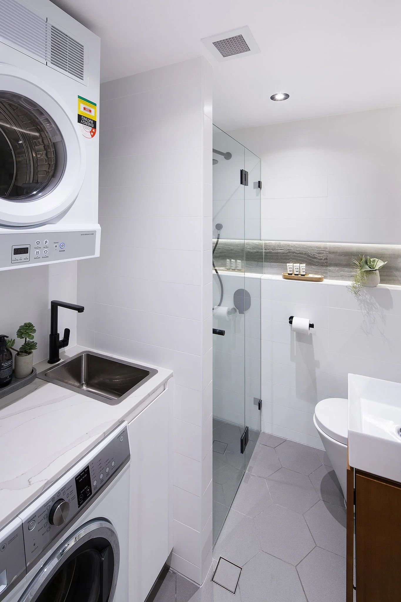 Efficient laundry space, compressed to include a powder room, a balance of bench space and storage. Styled to match the rest of the apartment.
