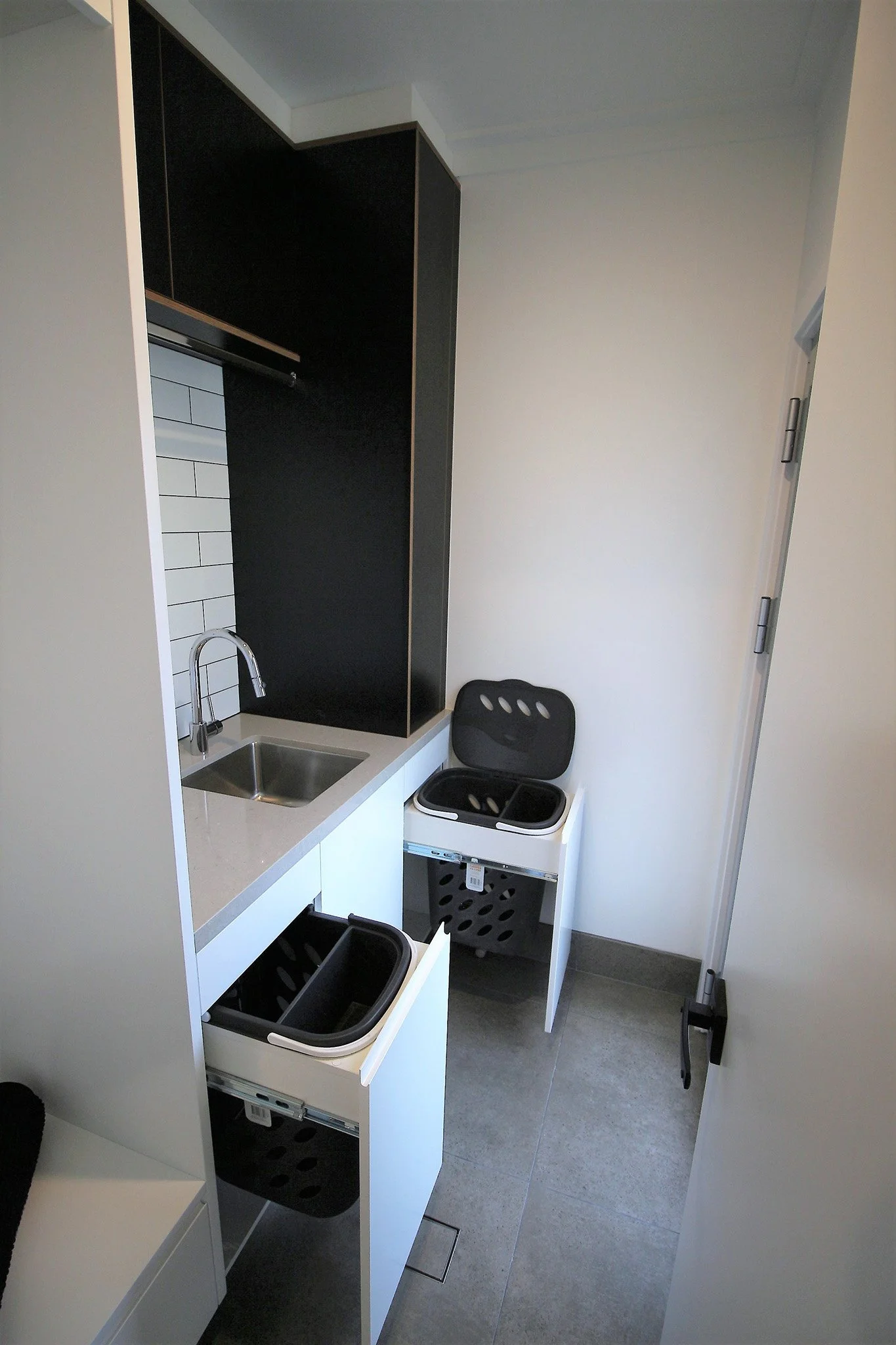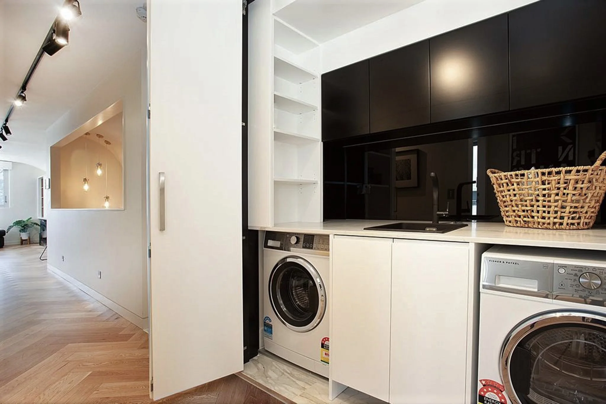 Laundry including bench space and drying rack incorporated into a Butlers Pantry in this apartment renovation, all hidden behind cavity slider doors.